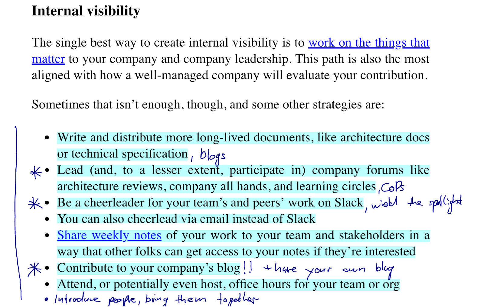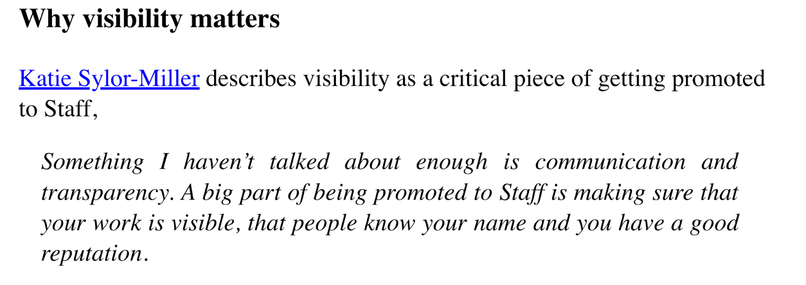 - And lastly Visibility. Visibility matters. Nobody tells you, but it matters. Here’s a quote from the Staff Engineer book: